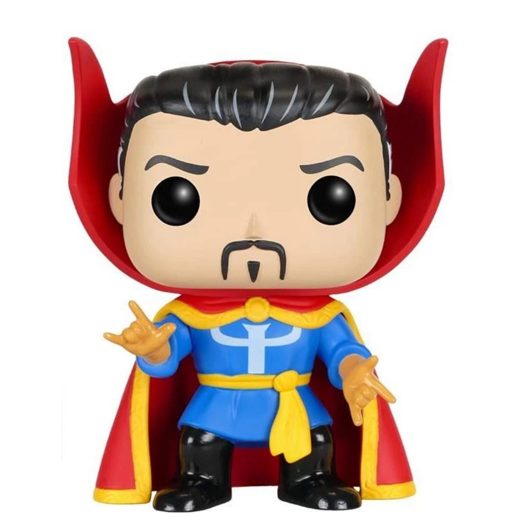 From his signature goatee to the vivid red cape and spell-casting hand gestures, this Funko Pop delivers a clean, timeless look that represents Doctor Strange at the height of his magical mastery.