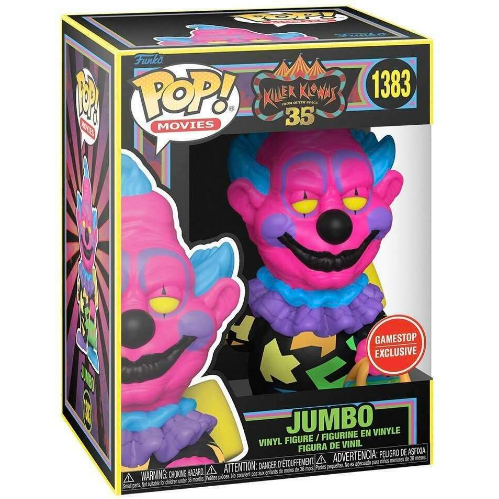 Unleash outrageous horror fun with Jumbo from Killer Klowns from Outer Space in a vibrant Blacklight edition. This Funko Pop! captures Jumbo’s oversized personality with exaggerated features, a mischievous grin, and eye-popping neon colors designed to glow under UV light. As a GameStop Exclusive, this version delivers maximum visual impact for fans of cult-classic chaos.
