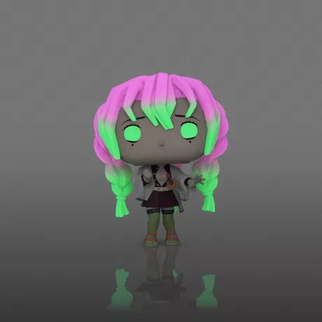 Step into the world of Demon Slayer with this glow-in-the-dark Fundom Exclusive Funko Pop! featuring Mitsuri Kanroji. With her iconic pink and green braids, fierce stance, and glowing elements, this Pop! captures the passion and strength of the beloved Love Hashira.