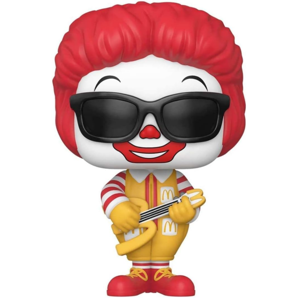 This figure shows Ronald wearing sunglasses while rocking out on a McDonald’s themed guitar. The playful pose, bright red hair, and classic yellow uniform capture the fun energy that made Ronald one of the most recognizable mascots in advertising history.